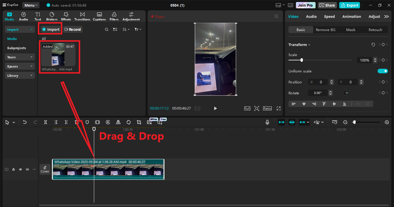 Start by launching CapCut Desktop and a new project. From the media panel, drag and drop or press the "Import" button to add all your clips. Similarly, import your music track, a song of your choice or one of the royalty-free tracks available in CapCut's database.