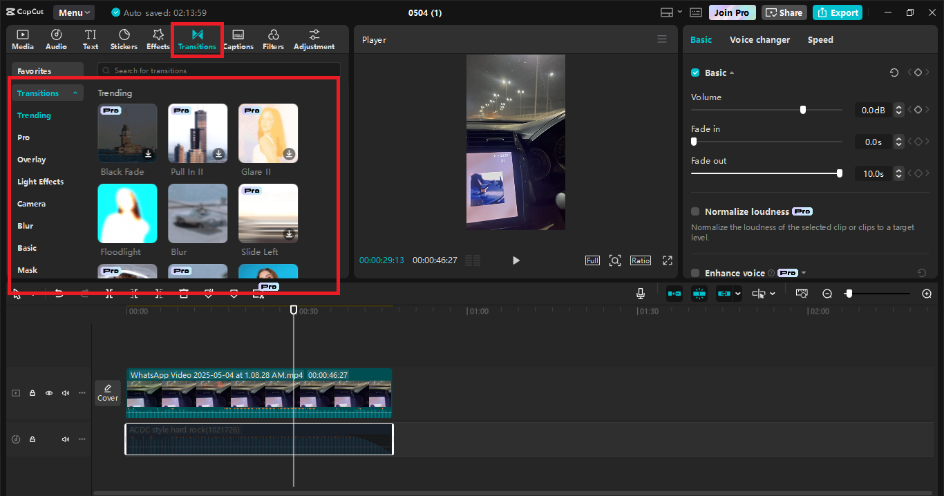 After your edits are in rhythm, you can start adding transitions. CapCut has a wide variety of options, from crossfades and whip pans to glitch effects and zoom transitions. If your beat is hard and punchy, then use quick-cut transitions or no transition at all—just harsh cuts. If you're working on slower music, you might want to use smoother transitions like fades or blurs.