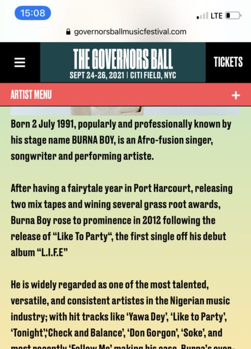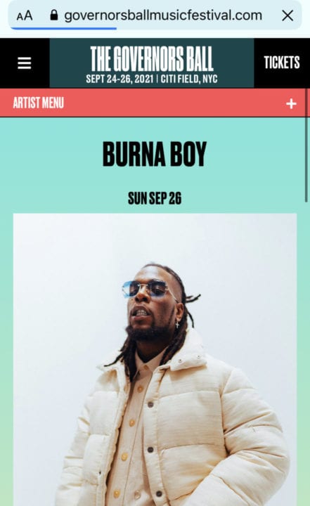 The announcement was made by the official account of The Governors Ball. The music festival is currently scheduled to take place in September from 24th to 26th while Burna Boy will perform on the 26th of September 2021 with American superstar, Billie Eilish as the headliner for the day.