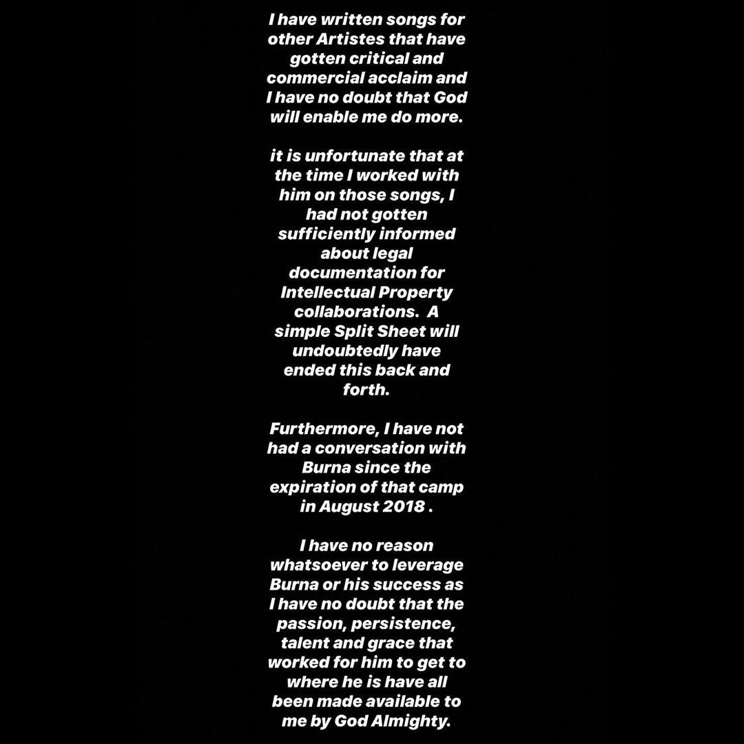 In a coherent statement, Ceeza has responded to Burna, confirming he wrote 'On The Low' but also admitting that Burna also added some words to the song. He pointed out how unnecessary it was for Burna to resort to threats and informs the public that he will be contacting the appropriate agency to ensure his safety as regards to Burna's threat.