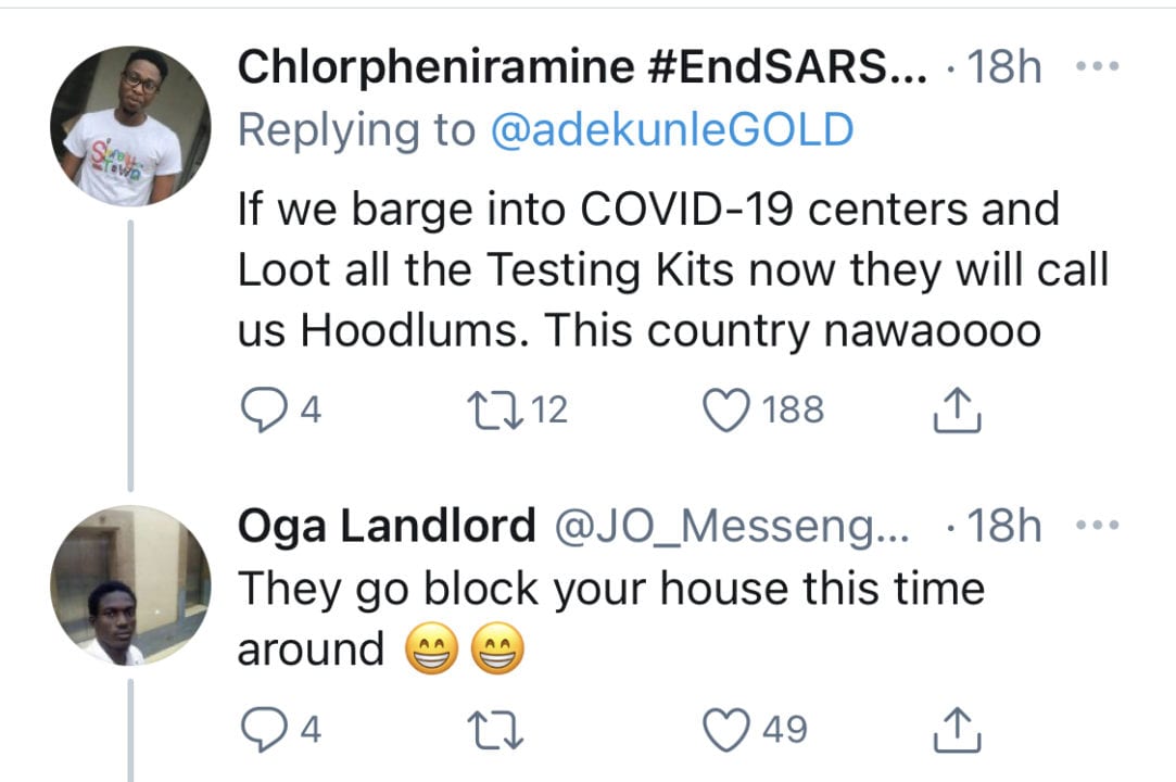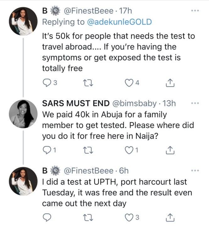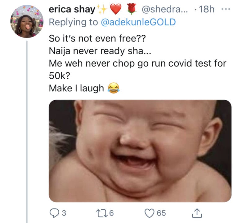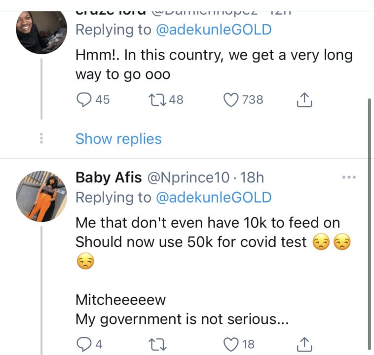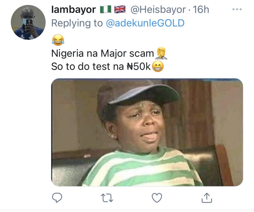 This question got fans reacting as some clearly state why a COVID test worth 50,000 Naira will not work in a country like Nigeria where minimum wage is presently not up to that amount. According to a Twitter user, “I have not seen 10k it’s 50k I want to use for covid test.”