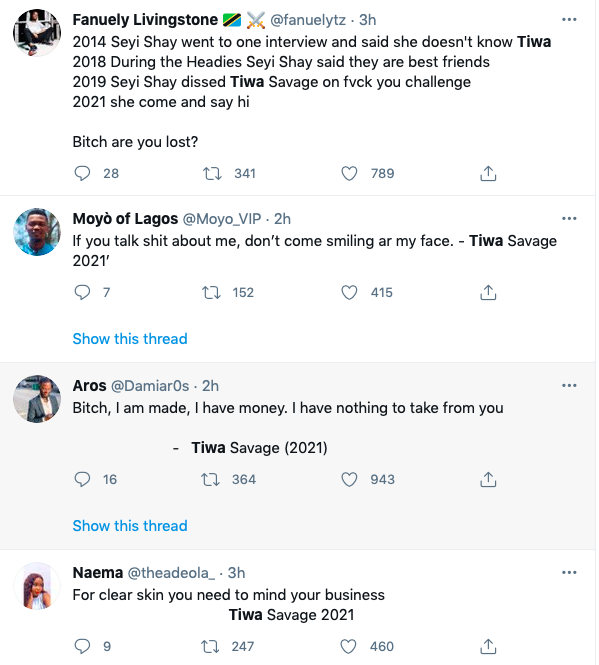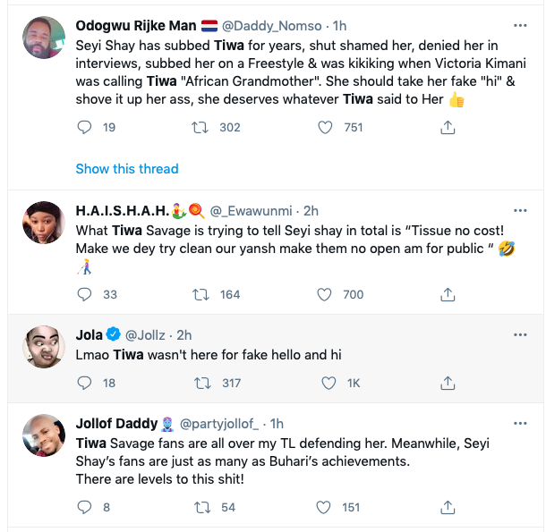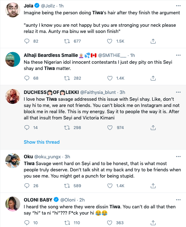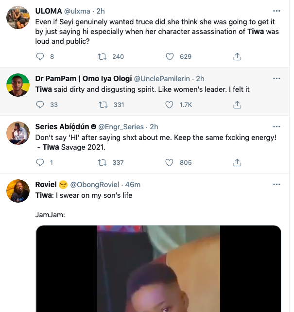 According to @Daddy_Nomso, "Seyi Shay has subbed Tiwa for years, shut shamed her, denied her in interviews, subbed her on a Freestyle & was kikiking when Victoria Kimani was calling Tiwa "African Grandmother". She should take her fake "hi" & shove it up her ass, she deserves whatever Tiwa said to Her..." while others like SallySulieman are heartbroken about the clash as they believe the two afrobeats queens should not be resolving their issues like this and also not be cursing with the name of their children; "I said a prayer for Jam Jam (Tiwa’s son). Please do not swear when you are having an altercation with someone even if you are innocent. 70% of the time, the person isn’t worth it. Don’t bring your children, siblings or parents into it. Tiwa and Seyi Shay "