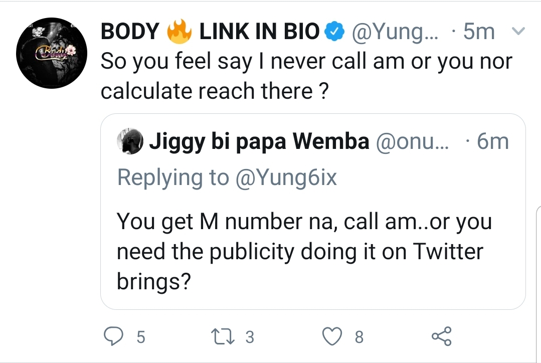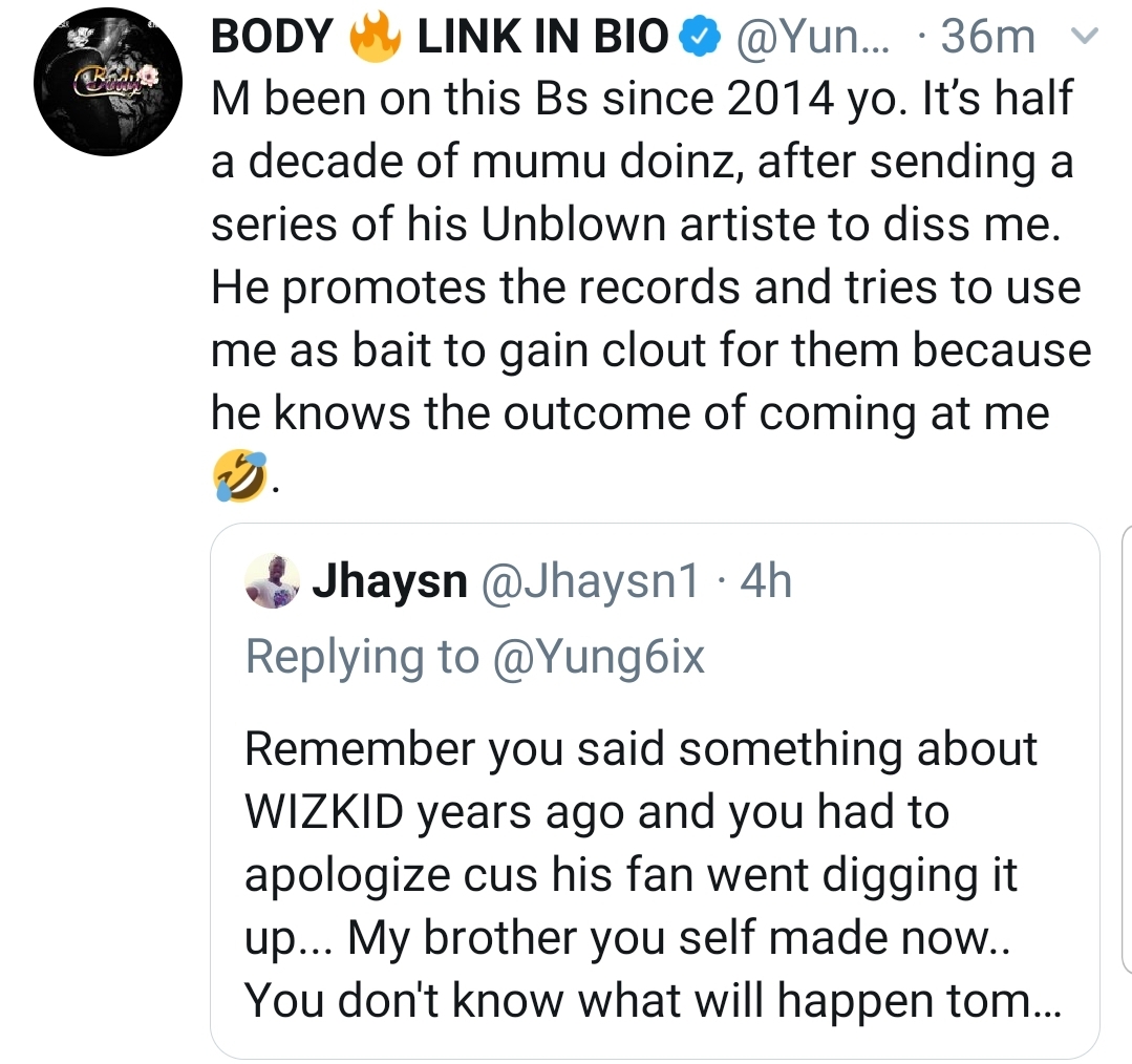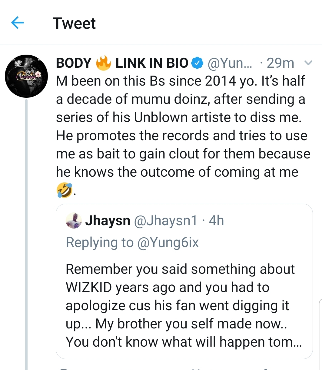 Responding to social media users who are saying that 6ix is chasing clout, Yung6ix responded that he has been silent all these while, while Abaga sends his series of "unblown artists to diss me..."