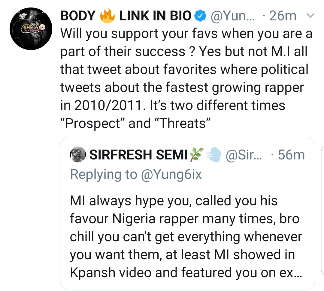 Y6ix has expressed himself in a series of tweets stating that M.I Abaga, although state publicly that is a fan of his, don't support him. According to Yung6ix, Abaga's public show of love and support is only "political" and has never translated to actual support. He went further to state that even when they recorded a song together, M.I did not promote the song on his personal social media profile.