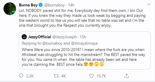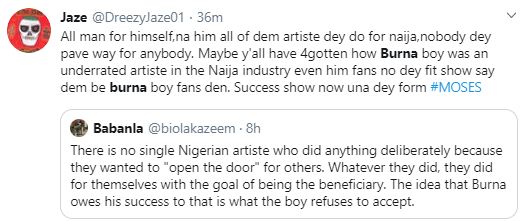 Following his statements on Twitter that no one paved way for him and that the Nigerian music industry is hypocritical in nature, Burna Boy is massively trending as Nigerians demand he gives credit to those deserve it by acknowledging that there were people who did not just come before him into the music industry, they also did the hard work to ensure the artistes after them have it easier than they did.
