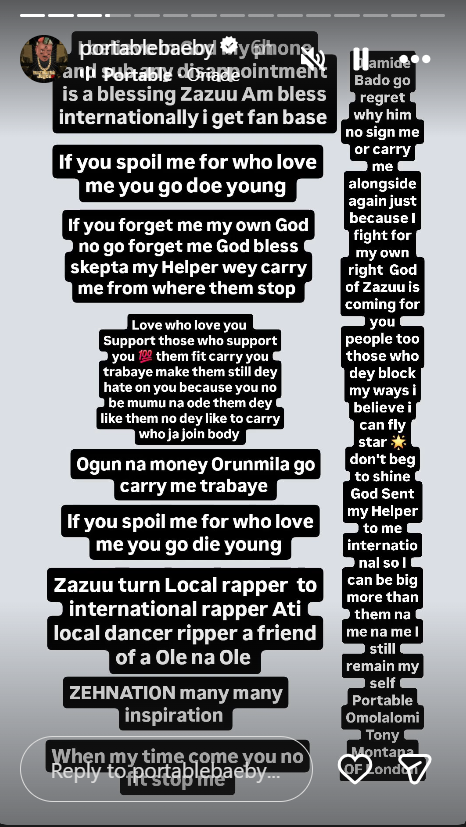In a lengthy, emotional message shared online, Portable reflected on his journey from a local rapper to a rising global act, crediting his resilience, divine guidance, and growing international fan base for his progress.