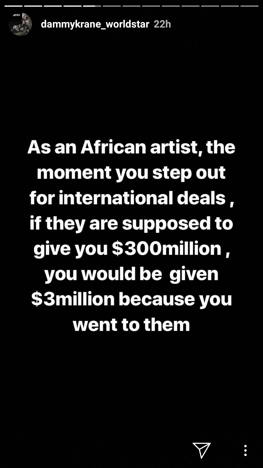 To Dammy Krane, an artiste gunning for international deals will eventually short change himself as he or she won't be valued according to their worth, a statement that is in support of Burna Boy's statement.