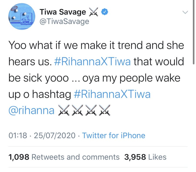 Nigerian superstar Tiwa Savage is throwing away pride and going hard for what she wants, which in this case is a collaboration with Rihanna.