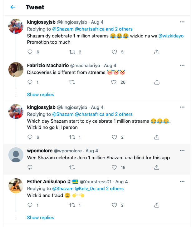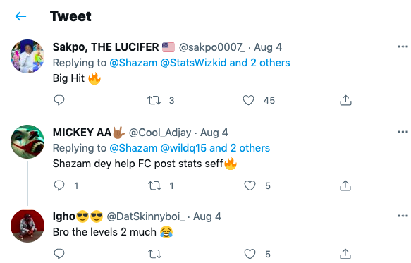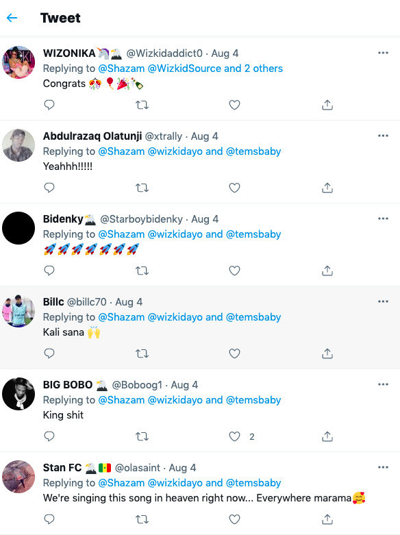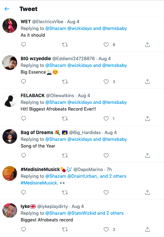 This was made known by the music searching app, Shazam, via their Twitter page on the 4th of August 2021 where they announced that the song has reached one million shazam.