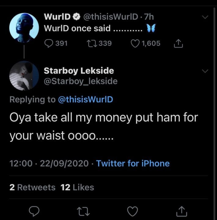 Afrosoul singer, WurlD, took to his Twitter page to ask a seemingly common question, “WurlD once said” and this tweet was going as planned until a WizkidFC came under the tweet to dash WurlD Wizkid’s lyrics.
