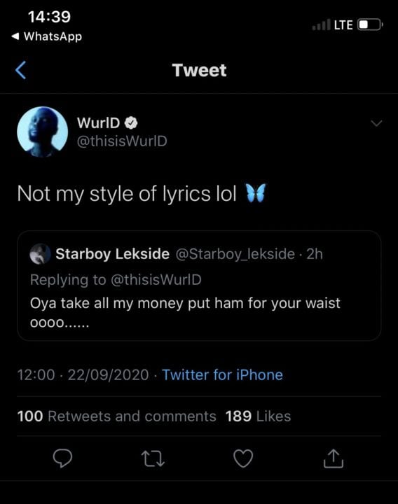 It is important to note that WurlD, who has now deleted the tweet because oga doesn't want trouble, did not in any way imply that Wizkid’s lyrics are inferior, he only stated that such lyrics aren’t his style.
